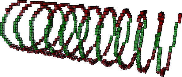 By trying to digitize a curve with a high, with respect to the grid, curvature we can arrive at a connectivity problems. For instance, if we consider an elliptic helix of radii 20, 1 and period distance 1, and \( K_{NEXT} = 2 \), we can observe connectivity issues i.e., there are at least three points such that they are 26-connected to each other and therefore the curve is not 26-connected in such a place.