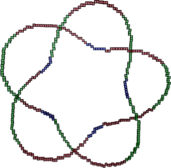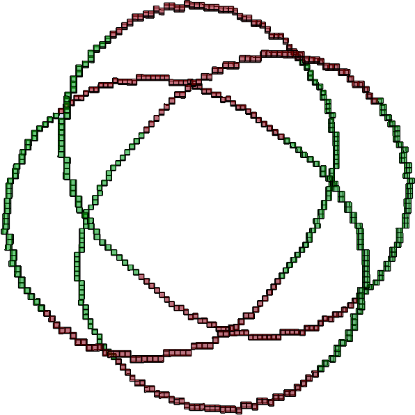 Output: A sequence of integer points, which connectivity, in some places, may depends on \( K_{NEXT}, t \) and the relation between the curve's curvature and the digital grid (see some examples below).