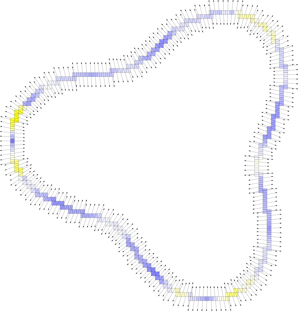 This example shows the computation of the VCM of a set of 2D digital points. The normal is estimated from the diagonalization of the VCM tensor. Feature detection is achieved with the eigenvalues of the VCM. A red color indicates a feature. Normals are displayed as arrows.