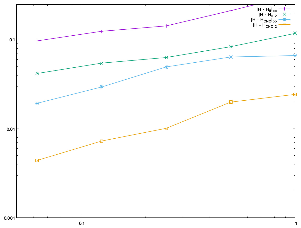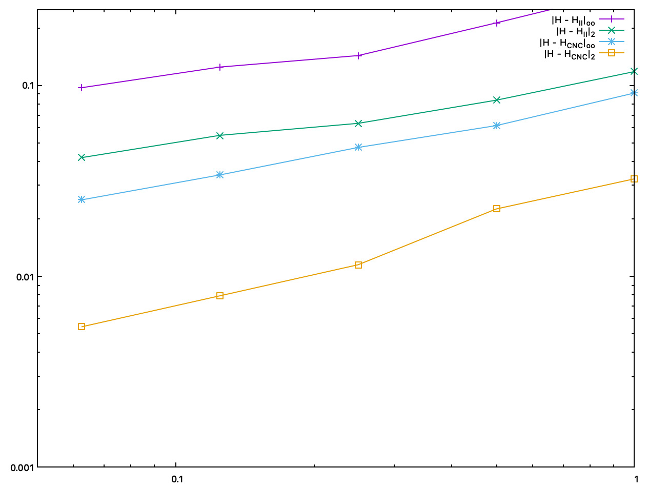 Accuracy comparison between II and interpolated CNC mean curvature estimates, as a function of the digitization gridstep |