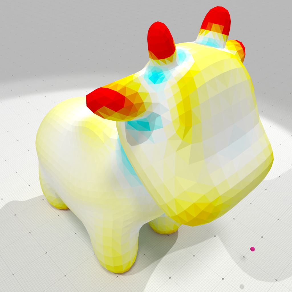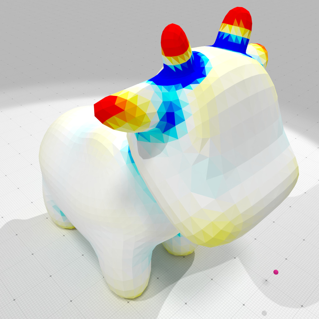 \) as a normal vector per vertex, the field is then linearly interpolated. We can now compute three measures onto the mesh, mu0 the area measure, mu1 twice the mean curvature measure, and mu2 the Gaussian curvature measure. You have static methods CorrectedNormalCurrentComputer::meanCurvature and CorrectedNormalCurrentComputer::GaussianCurvature that estimate respectively mean and Gaussian curvature from measures.