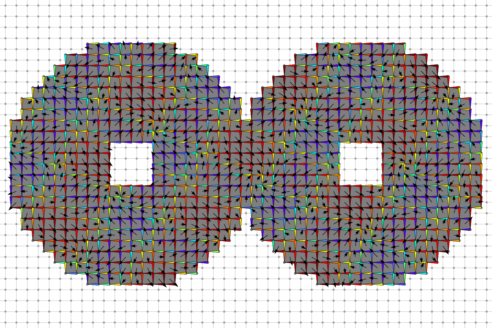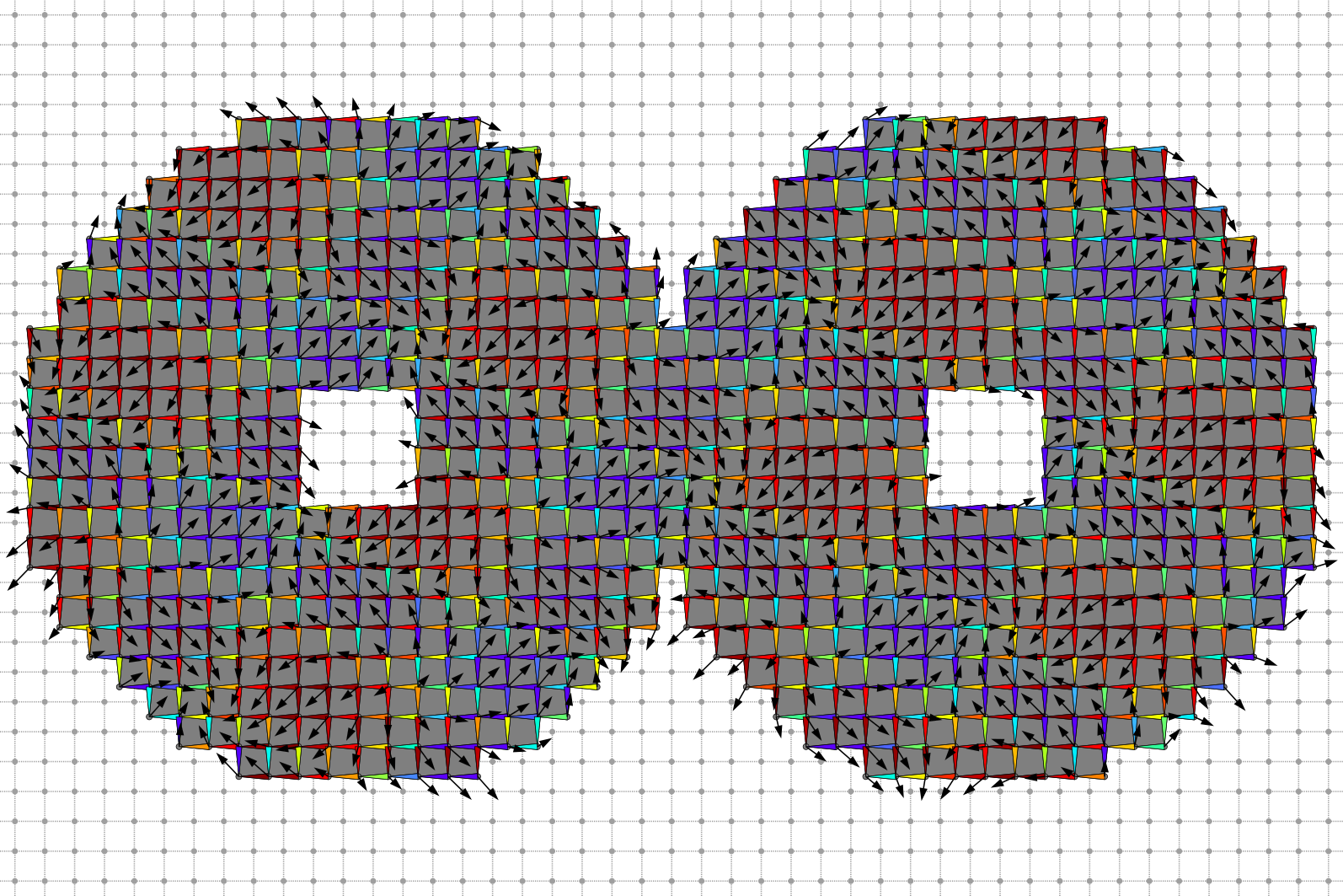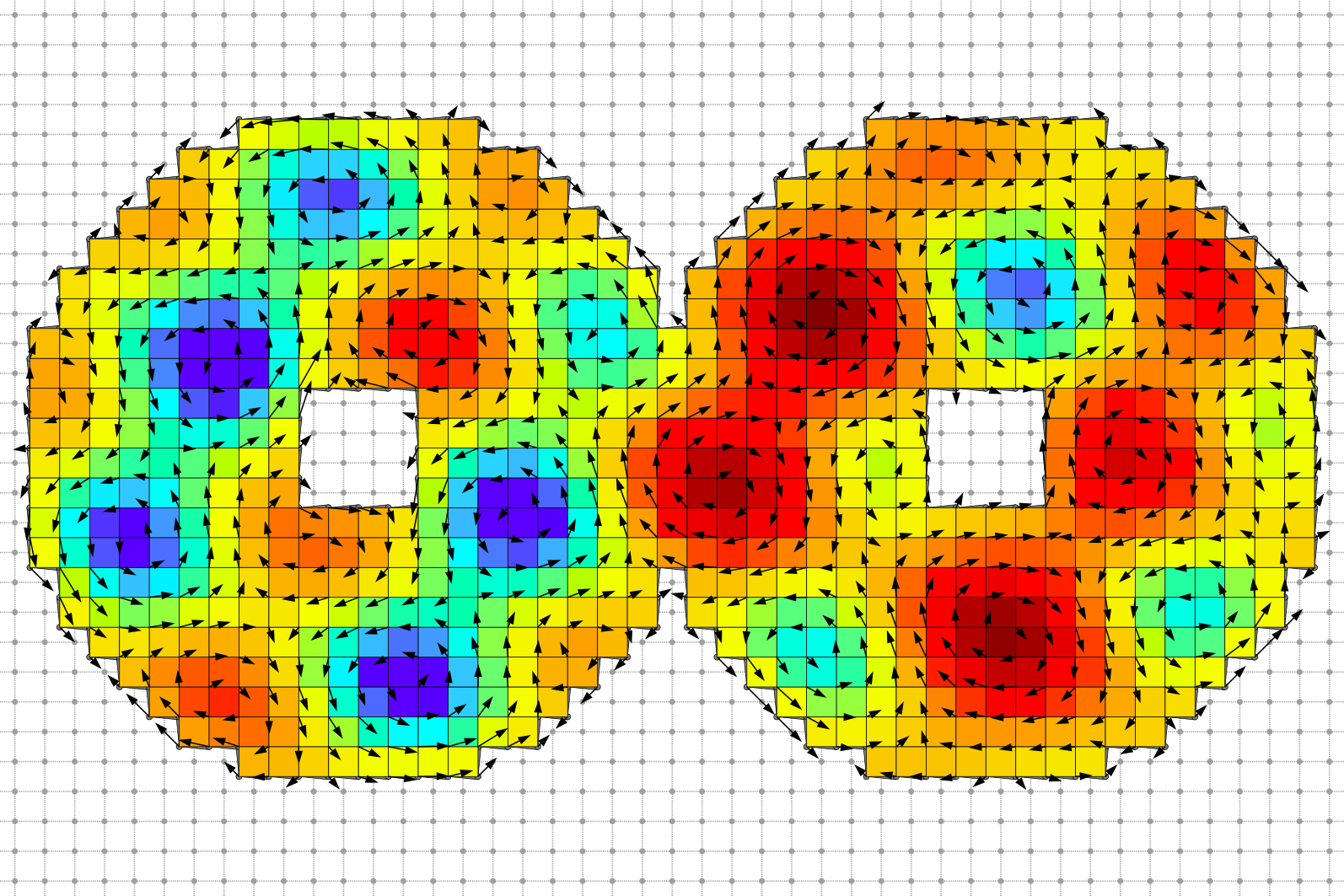 In this example, we compute primal and dual Helmoltz decomposition of an arbitrary vector field on a 2D double ring shape. Snippets are taken from exampleDiscreteExteriorCalculusSolve.cpp.