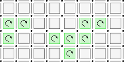 The idea here is to connect surfels that share some \(n-2\)-cells. The obtained adjacency relations are called bel adjacencies in the terminology of Herman, Udupa and others. Generally an \(n-2\)-cell is shared by at most two \(n-1\)-cells, except in "cross configuration", symbolized below: