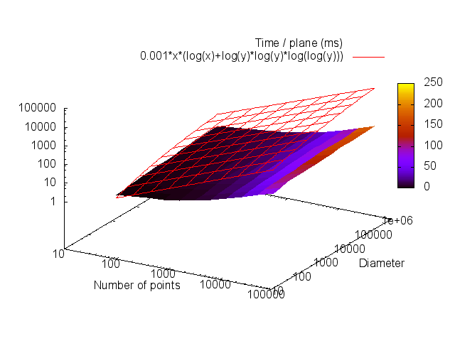 We have runned the following benchmark to estimate the average speed of COBA algorithm. For each experiment, 1000 naive planes were randomly chosen. Then, for an input diameter D, N points are randomly chosen in the parallelepiped D x D x D, such that they belong to the plane. We measure the time T to recognize these points as a naive plane (all calls to extend succeed). We also measure the number of updates k for this recognition. The following figures show the obtained results for a number of points varying from 50 to 100000 and a diameter varying from 50 to 1000000. It shows that the algorithm performs better in practice than the given upper bounds, even assuming \( k = \log \log D \) and v constant.