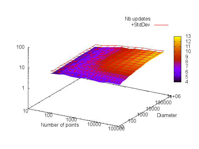Number of updates (and deviation) when recognizing a naive plane, as a function of the number of points N (x-axis) and the diameter (y-axis). This number is averaged over 1000 random recognitions.