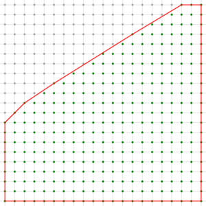 This example shows how to create a LatticePolytope2D that represents a square. Then given integer parameters a, b, c, it cuts the polygon by the half-plane \( ax+by \le c \). It also outputs some statistics.