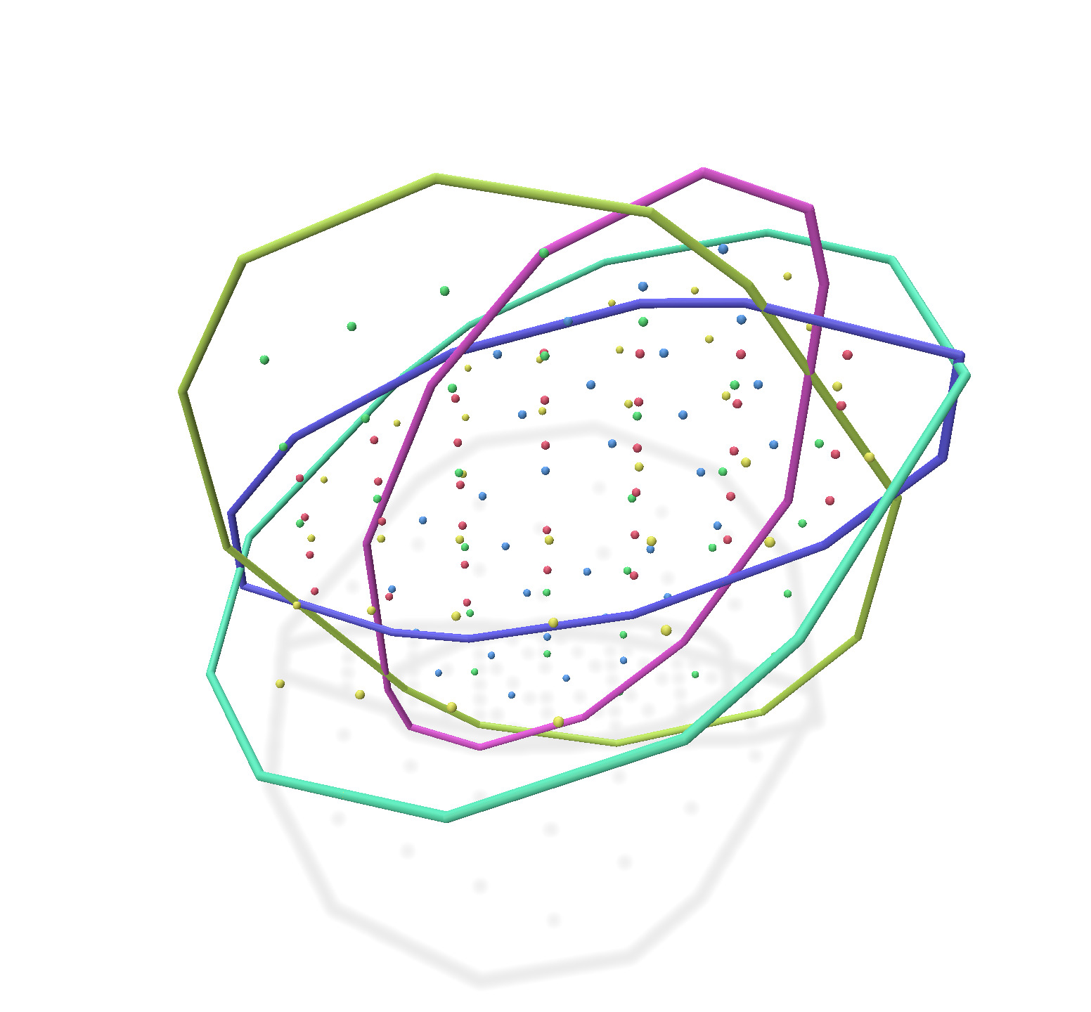 Computes the convex hull of N 4D points within a ball of radius R, these points belonging to a lattice of chosen dimension D. Displays their projections along the different main axes.