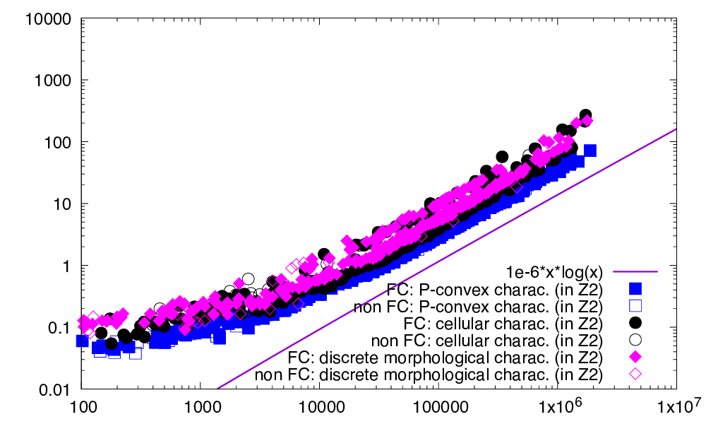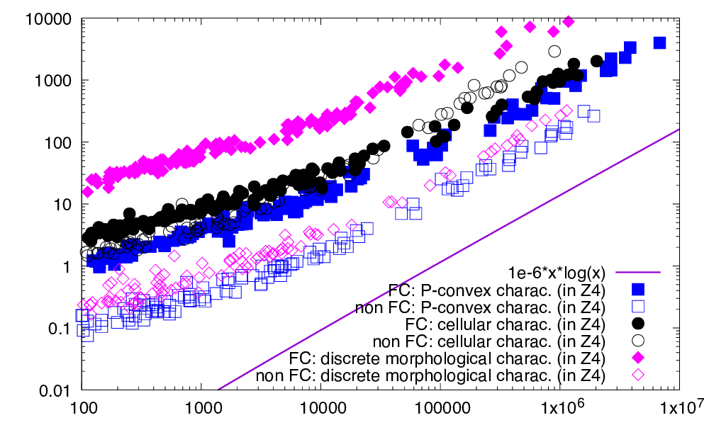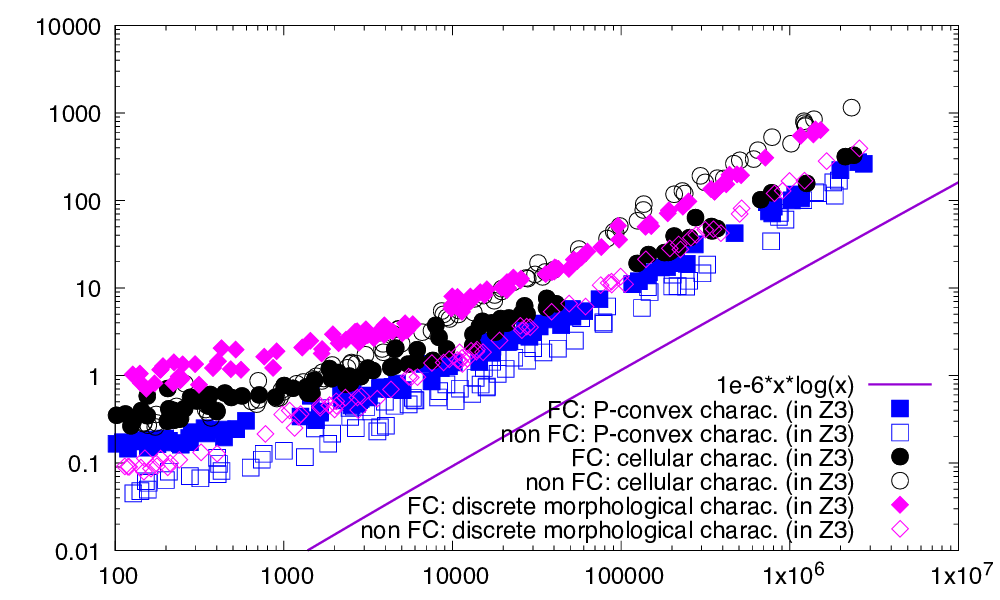 Computation times (ms) of P-convexity wrt full convexity in Z3 as a function of the cardinal of the digital set. P-convexity is generally 3-10x faster to compute. The difference is greater for non P-convex / non fully convex sets.