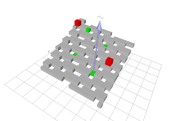 This example shows the recognition of a simple digital plane with the COBA algorithm (class COBANaivePlaneComputer). Green points belong to the naive plane. There is no naive plane containing the green points and any one of the red points.