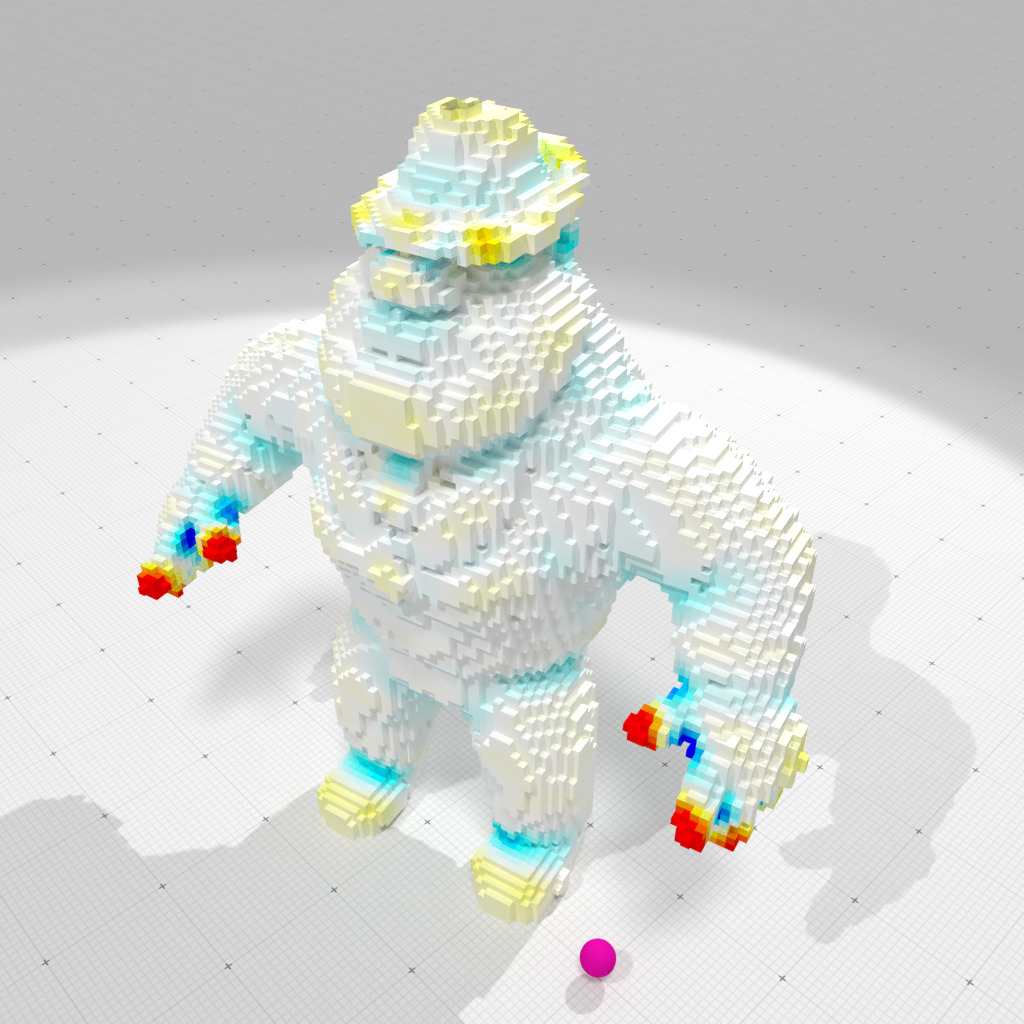 Here we just provide the corrected normal vector field \( \mathbf{u} \) as a normal vector per vertex, the field is then linearly interpolated. We can now compute three measures onto the mesh, mu0 the area measure, mu1 twice the mean curvature measure, and mu2 the Gaussian curvature measure. You have static methods CorrectedNormalCurrentComputer::meanCurvature and CorrectedNormalCurrentComputer::GaussianCurvature that estimate respectively mean and Gaussian curvature from measures.