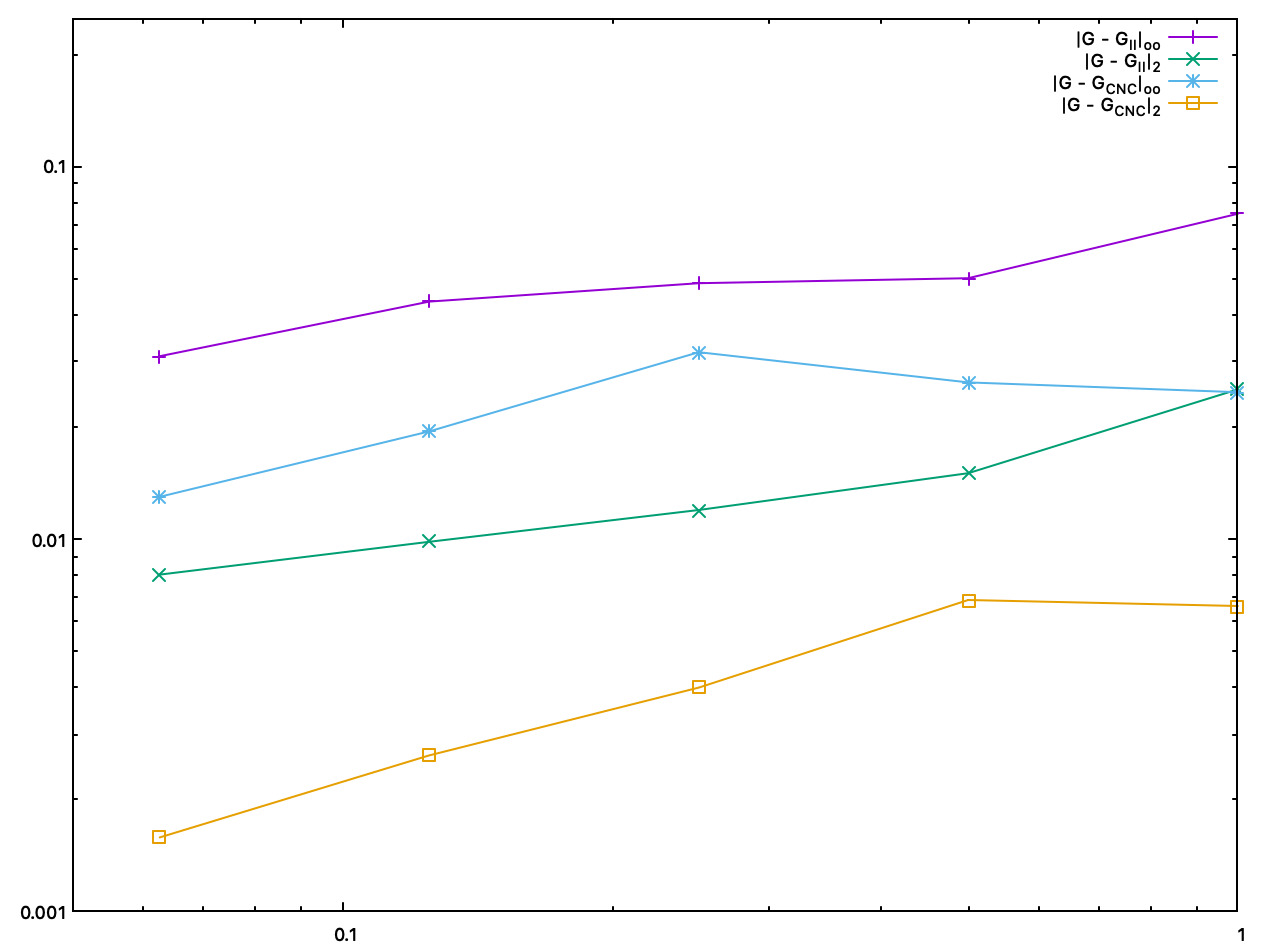Accuracy comparison between II and interpolated CNC Gaussian curvature estimates, as a function of the digitization gridstep |