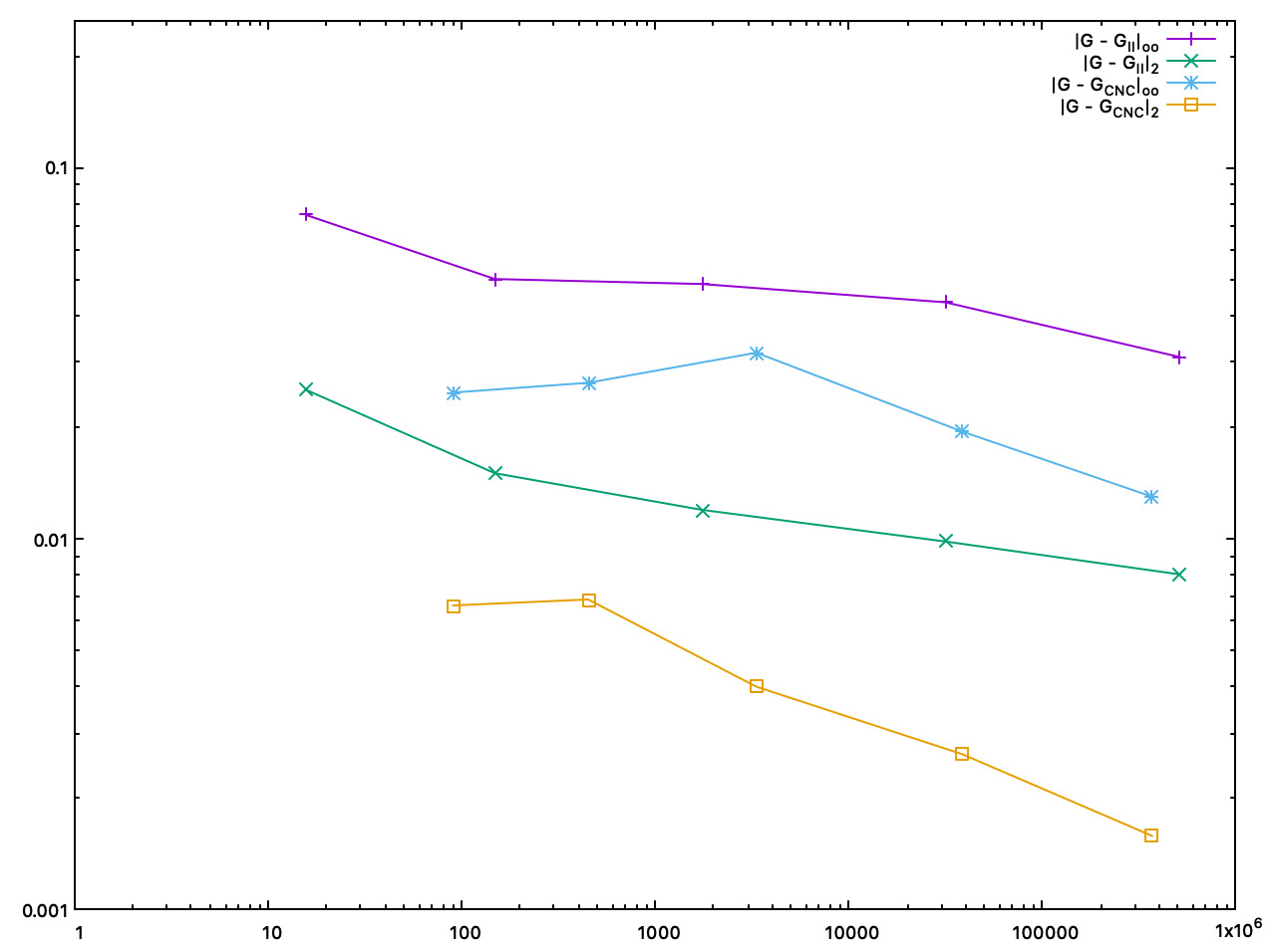Accuracy comparison between II and interpolated CNC Gaussian curvature estimates, as a function of the computation time (in ms) |