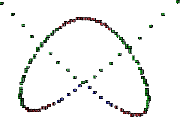By trying to digitize a curve with a high, with respect to the grid, curvature we can arrive at a connectivity problems. For instance, if we consider an elliptic helix of radii 20, 1 and period distance 1, and \( K_{NEXT} = 2 \), we can observe connectivity issues i.e., there are at least three points such that they are 26-connected to each other and therefore the curve is not 26-connected in such a place.