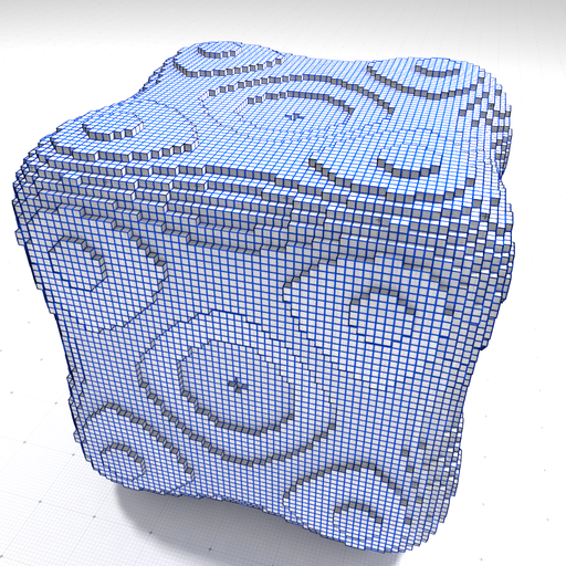 Note that the user can specify the number of steps of the gradient descent as well as the initial learning rate. Note that if the DigitalSurfaceRegularization::regularize() method is called another time, the descent starts from the previous results (aka warm restart). Using the default settings (and the trivial normal vectors), we obtain the following reconstruction.