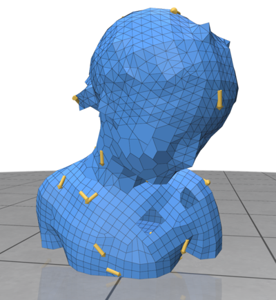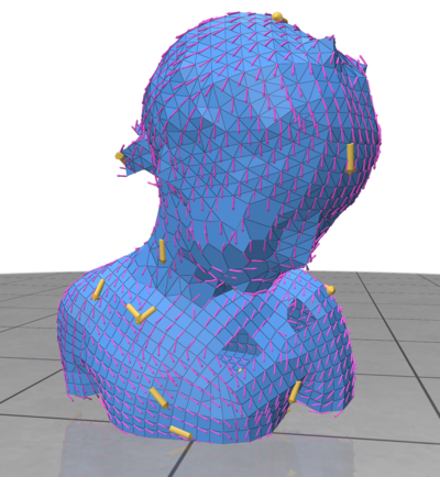 - Given vectors sources \( \phi \) at a mesh vertices, we first solve a vector heat diffusion problem: Integrate the heat flow \( u \) such that \(\Delta^{\nabla} u = \frac{\partial u}{\partial t}\) using a single step backward Euler step: \((Id - t\Delta^{\nabla}) u_t = \phi\). That step diffuses vector directions correctly using Levi-Civita connection but not vector magnitudes hence we then solve the two following (scalar) diffusion systems: