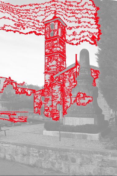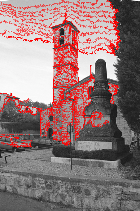 This example will load the pgm source file "church.pgm" and applies successive thresholds [100,105], [100, 110].... [100, 220] and selects all the boundary contours with a minimal size equals to 300 and with a distance between its barycenter and point (129 526) less than 300.