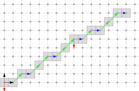 The arithmetical representation \( (a, b, \mu) \) is redondant. Exactly two representations describe one DSL. For instance, \( D(2,5,0) \) and \( D(-2,-5,-5) \) corresponds to the same set of points. This representation is thus interesting, since it includes an orientation preferably chosen to iterate over the DSL points from any point belonging to the DSL.