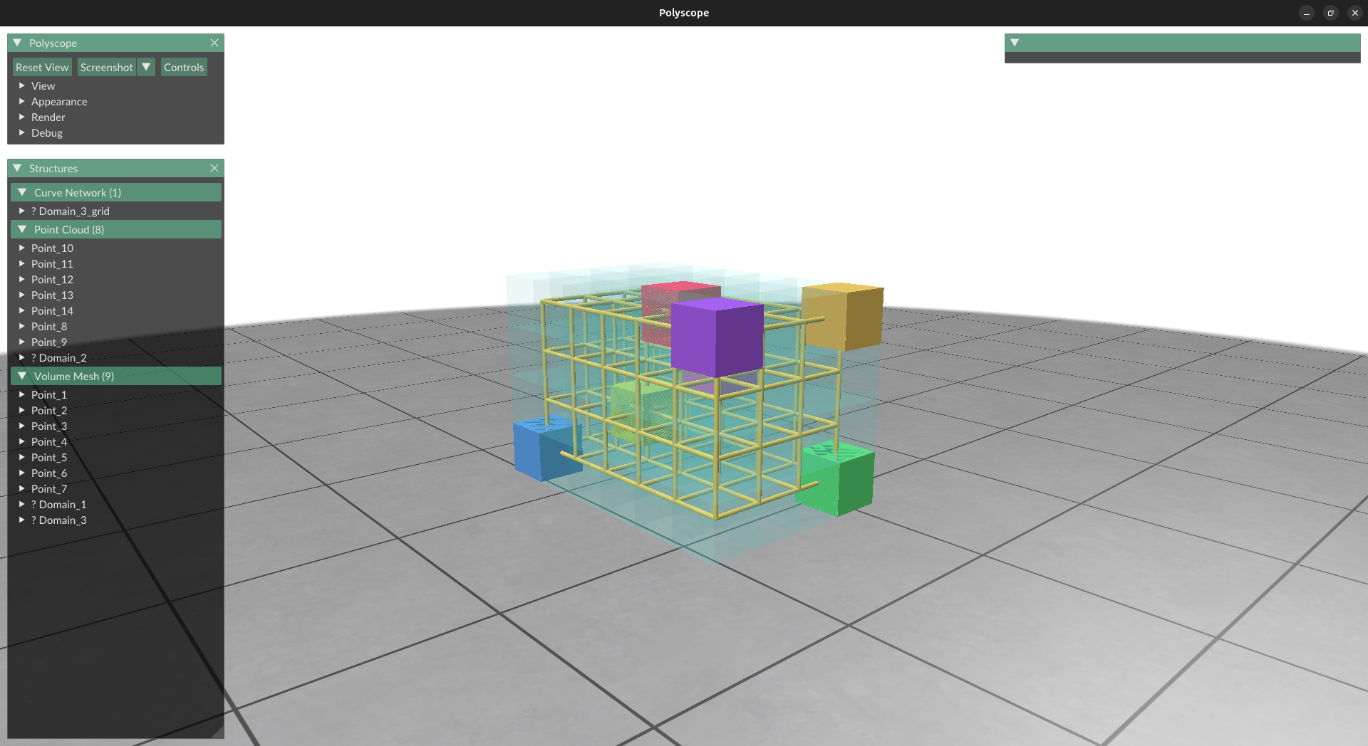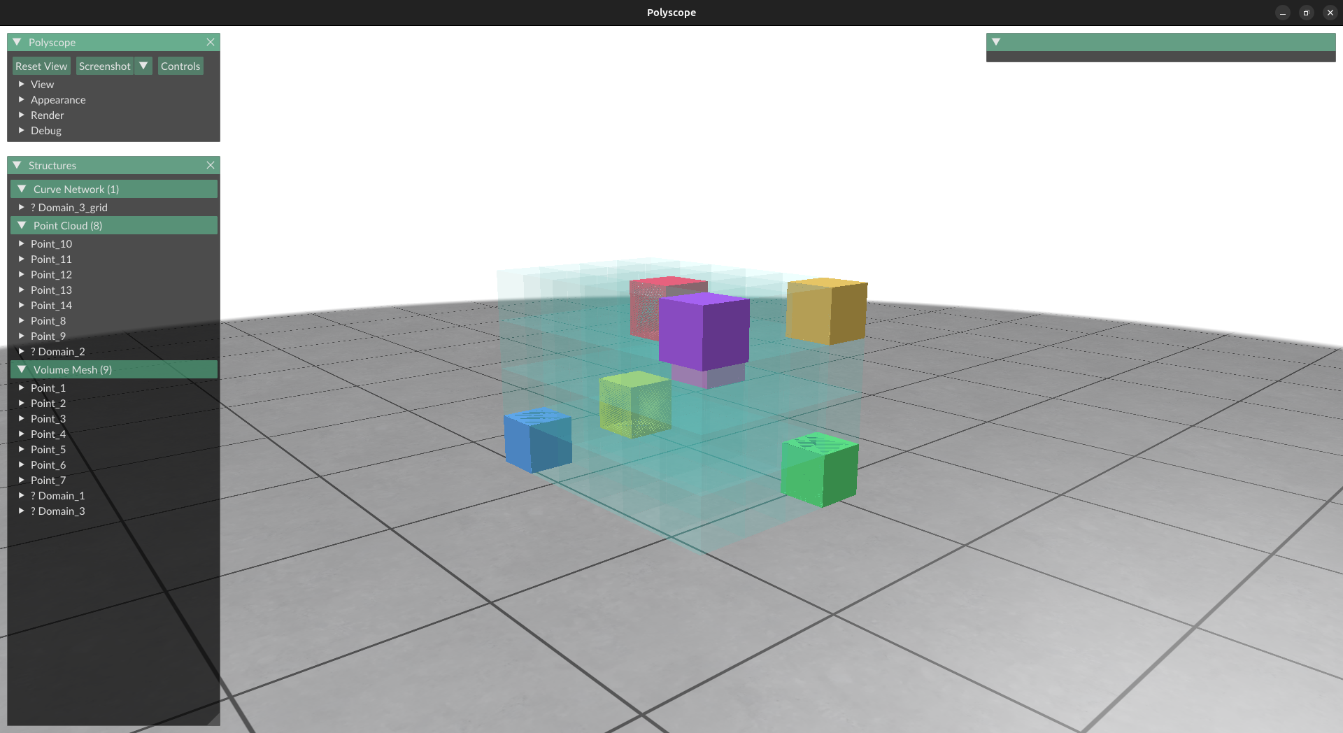 It permits displaying geometrical data such as Point, Lines and (volumetric) meshes. The library handles 3D scenes movement and allows to attributes of displayed objects (such as colors and colormaps). The graphical interface is based on ImGUI (https://github.com/ocornut/imgui) which can be further extended.