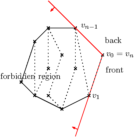 assumes that the input points form a simple polygonal line. Due to this assumption, any new point cannot be located in the cone formed by the first and last edge of the current convex hull (in red in the figure below). As a consequence, it is enough to update the convex hull by a Graham's scan from the front and/or from the back of the deque and it is never required to remove/insert points in the middle of the deque.