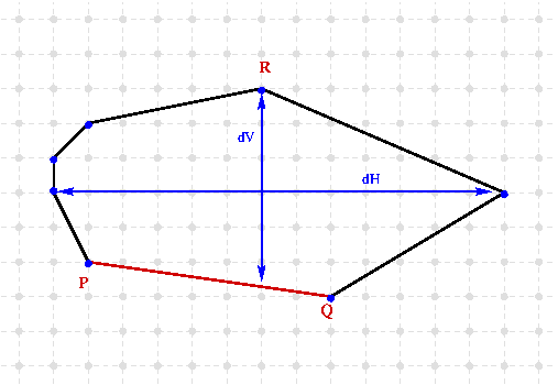 Two definitions of thickness can be computed from an iterator on the convex hull. The first one is the vertical/horizontal thickness obtained by projection on the main x-y axis from antipodal pairs. The second one is given from the normal projection on the edge of the same antipodal pairs. The two definitions are illustrated on the following figures: