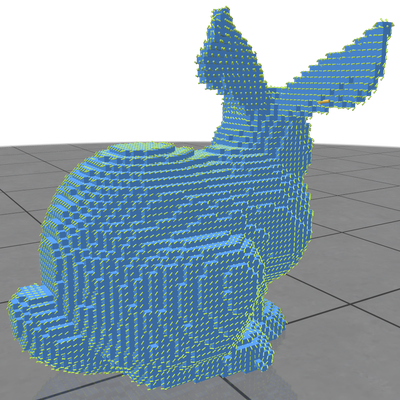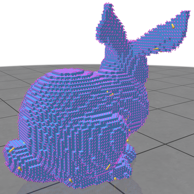 - Given vectors sources \( \phi \) at a mesh vertices, we first solve a vector heat diffusion problem: Integrate the heat flow \( u \) such that \(\Delta^{\nabla} u = \frac{\partial u}{\partial t}\) using a single step backward Euler step: \((Id - t\Delta^{\nabla}) u_t = \phi\). That step diffuses vector directions correctly using Levi-Civita connection but not vector magnitudes hence we then solve the two following (scalar) diffusion systems: