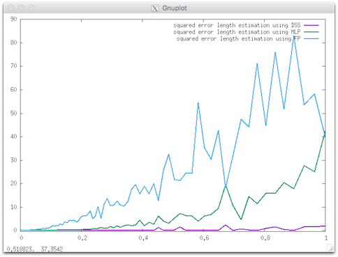 gnuplot> plot [0:][-0.5: 90] 'length.dat' using 1:(($7-$3)*($7-$3)) w l title "squared error length estimation using DSS", 'length.dat' using 1:(($8-$3)*($8-$3)) w l title "squared error length estimation using MLP", 'length.dat' using 1:(($9-$3)*($9-$3)) w l title "squared error length estimation using FP" linewidth 2